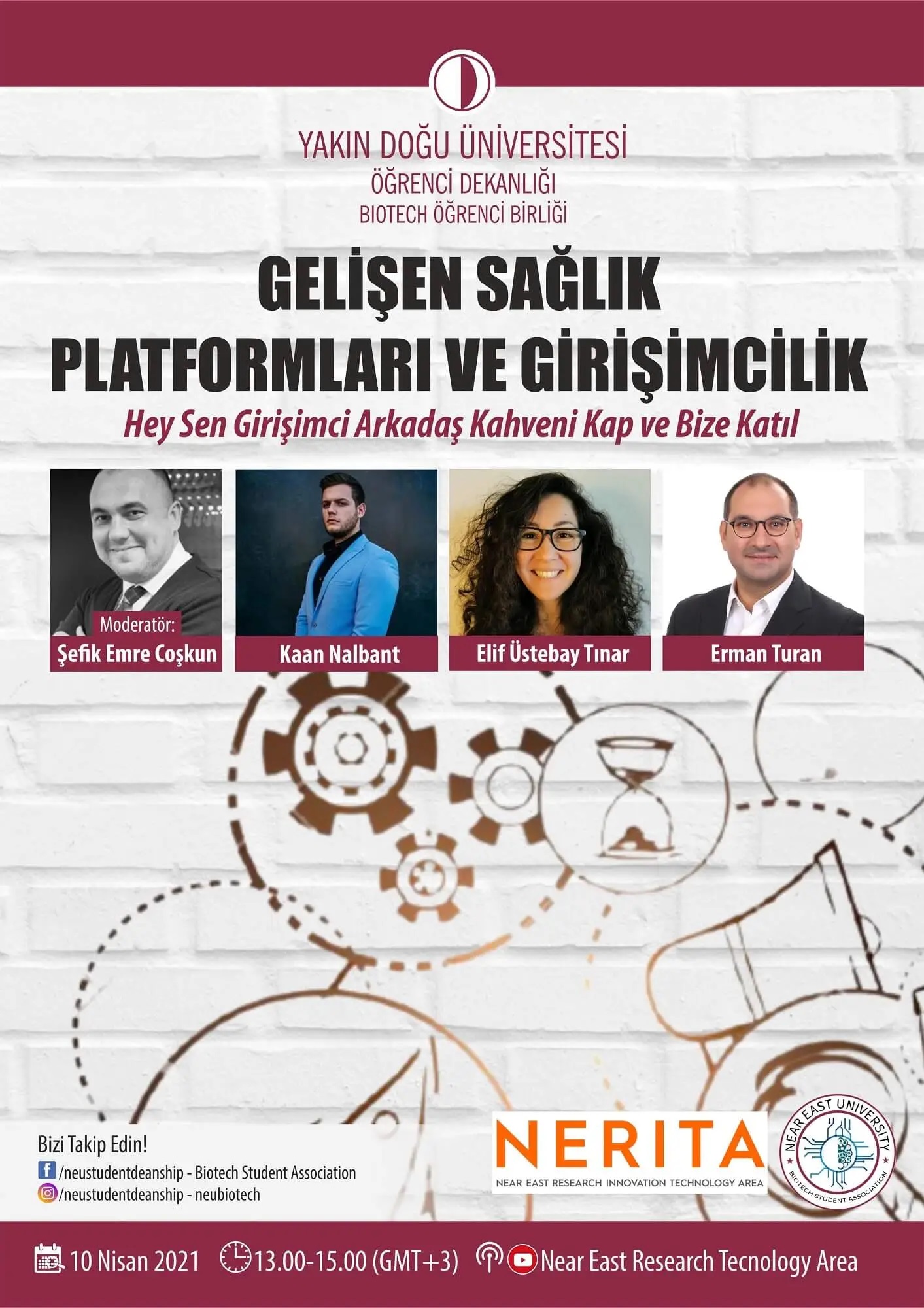 Near East Research Technology Area youtube kanalından 10 Nisan 2021 tarihinde gerçekleşen ve yayının moderatörlüğünü TTO Uzmanı Şefik Emre Coşkun’ nun yaptığı etkinlikte, girişimcilik konusunda önemli faaliyetlerde bulunmuş bu alanda deneyimli konuk konuşmacılar doktorlartakvimi.com’un kurucusu Elif Üstebay Tınar, doctorla.co’ nun kurucu ortaklarından Kaan Nalbant ve girişimcilik alanında danışmanlık sağlayan Addwise şirketi’ nin kurucusu Erman Turan tecrübelerini, geçtikleri tüm aşamaları, bu süreçlerde yaşadıkları zorlukları, girişimcilerin nelere dikkat etmesi gerektiğini, gençlerin karşılaşabilecekleri sorunları ve alanla ilgili önemli detayları paylaştı
